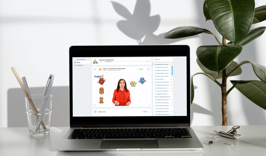 -20 уроков на платформе -150 заданий на отработку -объяснение через образы -базовые структуры: BE, HAVE, CAN, THERE IS/ARE, PRESENT SIMPLE